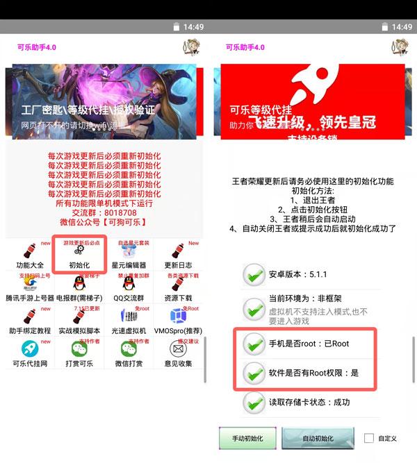 4、点击可乐助手中的【初始化】功能即可查看自己是否获得root权限授权;