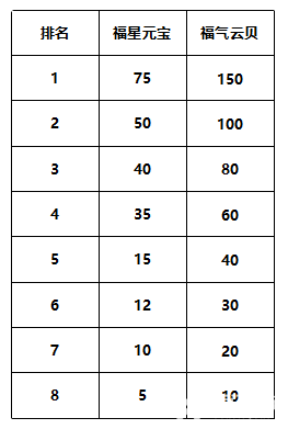【集福模式】单场排名可获得“福星元宝”和“福气云贝”数量如下: