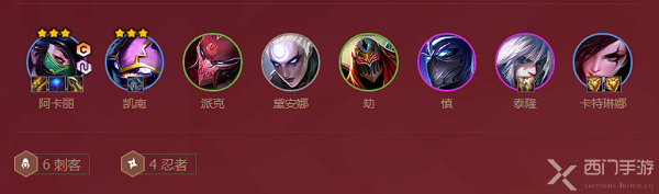 阵容英雄:阿卡丽、凯南、派克、皎月、劫、慎、男刀、卡特