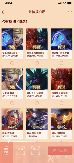 3、进入活动之后,选择英雄联盟手游,然后开始许愿,玩家一共可以选择一个稀有皮肤、一个伴生皮肤、一个英雄;