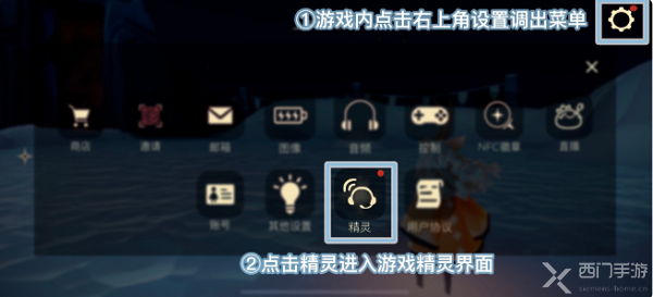 1、进入光遇手游后点击右上角位置的设置选项,点击后会弹出功能界面,点击其中的精灵选项;