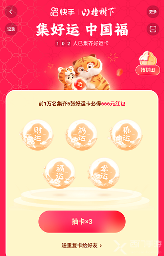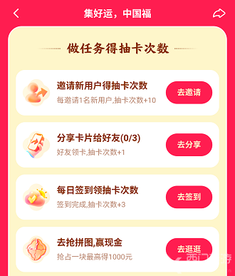 3、在集好运活动界面可以进行抽卡抽取各类幸运卡,前1万名用户集齐5张好运卡必得666红包;