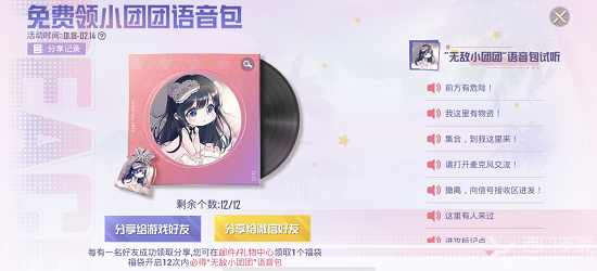 分享后可被12个不同的好友领取,若好友在【礼物中心】中领取祝福,您可前往【礼物中心】中领取回馈奖励。若好友在小程序中领取,您可前往邮件附件中领取回馈奖励。回馈奖励为小团团语音包福袋,开启福袋12次内必得“无敌小团团”语音包。