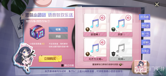 每开启1个小团团语音盒,可以随机解锁当前主题页面下的1条小团团语音并获得对应奖励,点击已解锁的语音可以进行试听。解锁重复的语音,自动转换成服饰币*1。