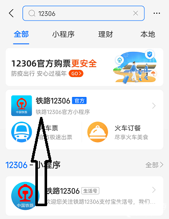 2、搜索后会出现对应的12306小程序,点击该选项进入对应的小程序界面;