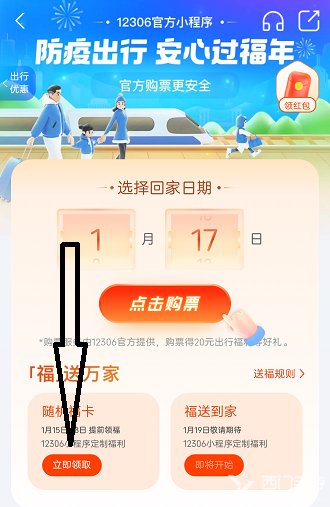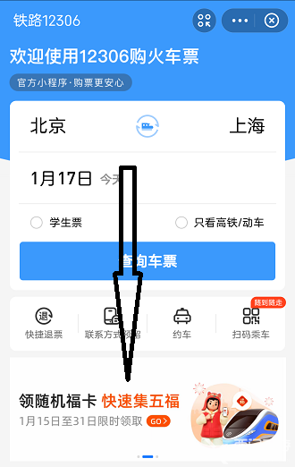 12306是一款为众多用户提供车票的软件,在软件中每天都有全新的车票进行放松,每年春节将至的时候都会有集福卡的活动,今年12306也可以开出福卡,下面小编就给大家分享下福卡领取教程。