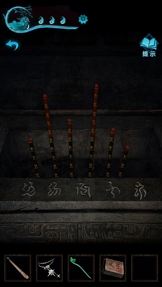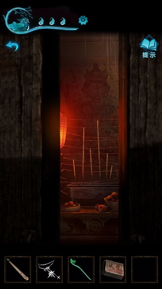 9、点击右边的门,将门打开可以看到后面的提示,这里会看到有五个高度不同的香,把这个香高度记下;