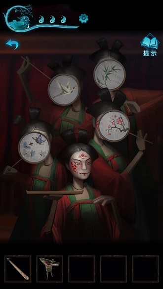 4、然后戏台上面会出现舞女,点击桌子上的酒杯获得酒杯,然后依次翻转团扇,从而得到脸上的图案;