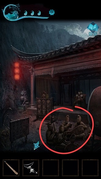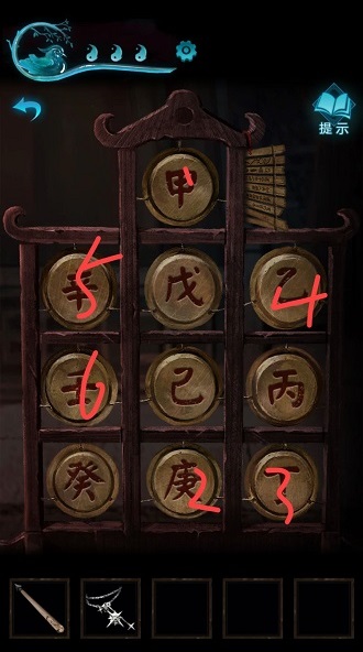 2、点击箭头查看附近的石像,点击石像获得短剑,点击中间的牌子,按照甲-庚-丁-乙-辛-壬的顺序用树枝敲打,这里的线索在石盘上可以得知;