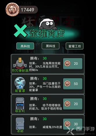 每次玩家游戏结束后会获得一定的蜜獾币,这些蜜獾币就可以在蜜獾商店里面购买部分的商品,这些商品在蜜獾商店购买后,进入游戏里面可以直接购买使用,不会消耗对应的金币和电力,可以让玩家在一开始的时候就能获得强力的属性加成。