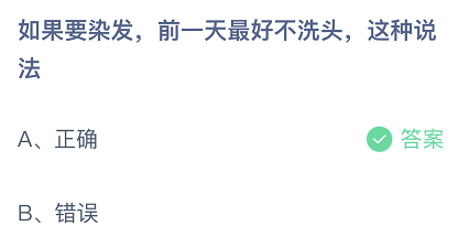 如果要染发,前一天最好不洗头,这种说法?这是今日的蚂蚁庄园小课堂的问题,很多玩家都比较关注这个话题,接下来就让小编为大家详细介绍一下,希望可以帮助到大家。