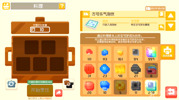 使用等级越高的锅子烹饪出品质高的食谱,吸引到的宝可梦稀有度越高,煮出的宝可梦会受到锅子的影响,前期使用铜锅烹饪出的宝可梦在后期还需要更换,银锅吸引的宝可梦属性更好。