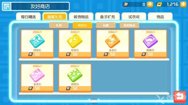 在游戏中,技能石最快的获取途径就是充值购买,在友好商店的超值礼包中选择“招式石”就可以查看并购买,6中技能石每个每人限购一个。