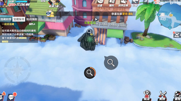 4.到达螺旋滑梯之后,点击“放大镜”可以开始探索,探索获得一张纸条,上面说这个“顽皮儿童”跑去船舶街的“OrangeHouse”小楼;