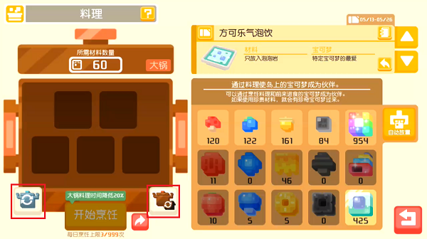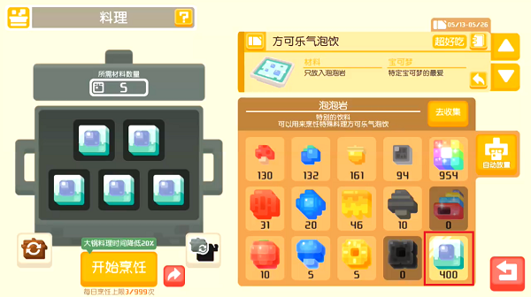 3.将锅子的每个格子都放入【泡泡岩】食材,点击这里查看泡泡岩获取方法;