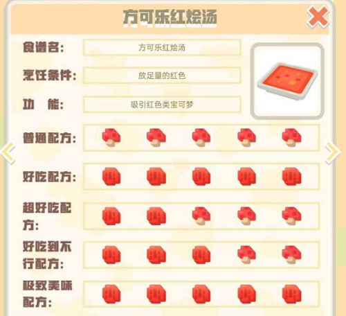 宝可梦大探险方可乐红烩汤怎么做?在宝可梦大探险游戏中,我们需要通过搭配不同的食材,获得不同的功能的食谱,使用食谱来吸引对应的宝可梦,那怎么制作方可乐红烩汤吸引红色类宝可梦呢,下面就和小编一起来看看吧!