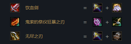 饮血剑:携带者的普通攻击会治疗自身,治疗量相当于40%的普攻造成伤害。携带者首次跌到40%生命值以下时,会获得相当于30%最大生命值的护盾值,持续5秒。它仍然会提供生命偷取。