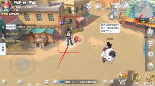 然后去左边码头上,可以看到冒险家的身影,以为他要对海猫动手了,赶紧阻止他。