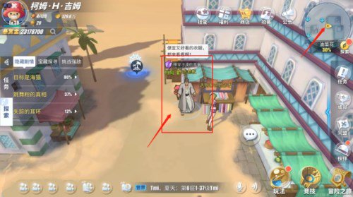 在告示牌附近的旅行家会咨询玩家,穿越沙漠需要准备些什么东西,可以推荐防风衣,但因为他体型宽大,只能定做,现在布店老板的排号又排到三个月之后,不知道该怎么办,并说道帮他解决问题会给一张藏宝图,咱们先去问问布店老板呗。