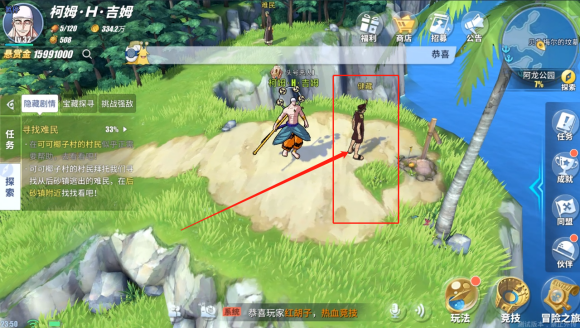 在公园的位置可以看到一个普通村民,在与村民交流后得知需要玩家去帮助重建后沙镇,难民在地图里贝鲁梅尔的坟墓旁边,在难民的旁边还有一个宝箱,打开宝箱后可以获得藏宝图,与上方难民沟通后返回可可椰子村街道上村民处找到NPC进行对话就可以完成任务;