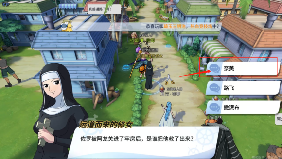 ①是谁把佐罗救了出来,答案是娜美(奈美),回答完第一个问题后修女去了后沙镇,这个时候玩家需要前往后沙镇找到修女回答第二个问题;