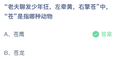 老夫聊发少年狂,左牵黄,右擎苍中,苍是指哪种动物-蚂蚁庄园4月30日答案