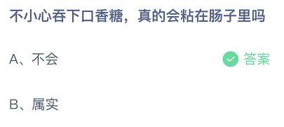 不小心吞下口香糖,真的会粘在肠子里吗?这是今日的蚂蚁庄园小课堂的问题,很多玩家都比较关注这个话题,接下来就让小编为大家详细介绍一下,希望可以帮助到大家。