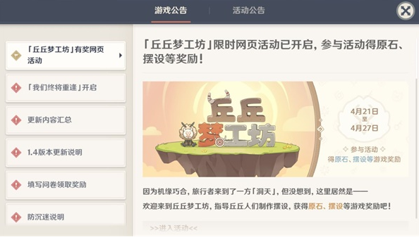 2.在原神游戏中,会有游戏公告,在游戏公告中找到“丘丘梦工坊限时网页活动”,点击即可参与。