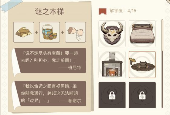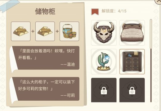 1.一共有4种材料,15种家具,不同的配方可以建造出不同的家具;