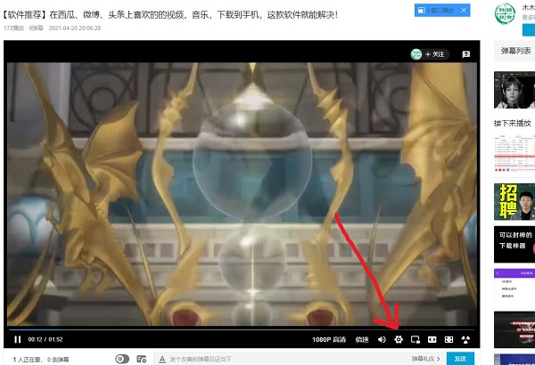 2.这个时候就会看见在视频的下面出现一个菜单栏,直接点击那个齿轮图标进入设置中;