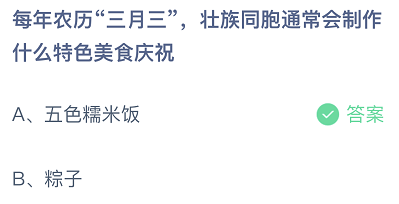每年农历“三月三”,壮族同胞通常会制作什么特色美食庆祝?这是今日的蚂蚁庄园小课堂的问题,很多玩家都比较关注这个话题,接下来就让小编为大家详细介绍一下,希望可以帮助到大家。