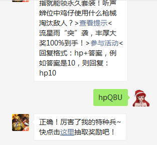 和平精英是一款非常火爆的实时对战手游,官方也经常会举行一些活动,很多和平精英的玩家都喜欢通过微信公众每日抽奖活动来获取大量的奖励。今天的每日抽奖问题就是:听声辨位中鸡仔使用什么枪械淘汰敌人?那么这个问题的答案是什么呢?接下来小编为大家详细介绍。