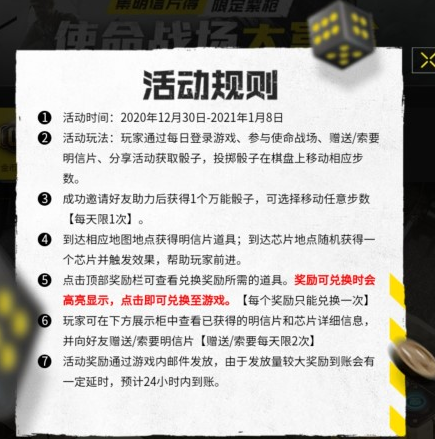 2.骰子的获取方式是:登录游戏、完成一局使命战场、赠送/索要好友明信片、分享一次活动;