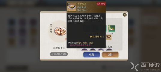 这道菜并没有自己的食谱,而是在做鱼羊双鲜时有机率获得,暴击率为2%,是一道很珍贵的食物。